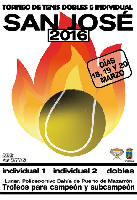 El club de Tenis Mazarrón en colaboración con la Concejalía de Deportes del Ayuntamiento de Mazarrón ha organizado un torneo para las fiestas de San José de Puerto de Mazarrón. La competición se celebrará entre el 18 y el 20 de marzo. Se disputará en las categorías de individual y dobles. Los primeros y segundos clasificados serán premiados con un trofeo conmemorativo.
