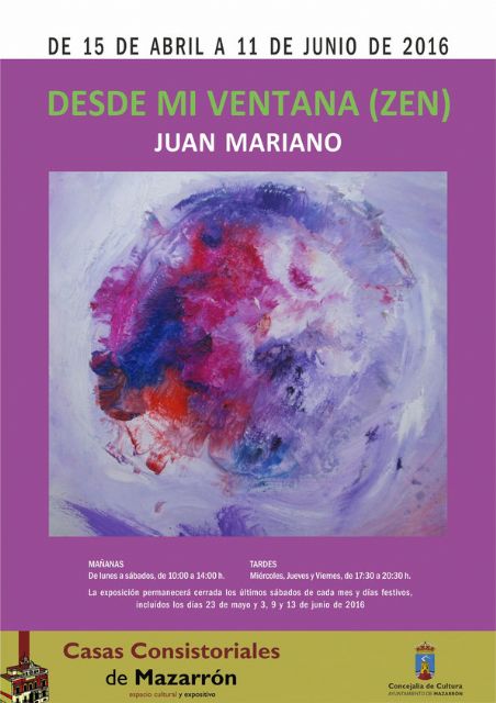 Juan Mariano Balibrea será el artista que exponga en Casas Consistoriales desde el 15 de abril y hasta el 11 de junio. El pintor murciano trae a Mazarrón su muestra "Desde mi ventana", un trabajo en el que el autor da rienda suelta al expresionismo abstracto que ha caracterizado gran parte de su obra. La exposición será inaugurada este viernes a las 20:30 horas.