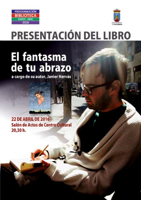 El joven autor mazarronero, Javier Hervás, presenta este viernes 22 de abril su libro "El fantasma de tu abrazo". Será en el Centro Cultural de Mazarrón, a partir de las 20:30 horas. Hervás fue recientemente galardonado con el segundo premio en la última edición del certamen de poesía "Declárate", por su trabajo "Miradas que no se cruzan".