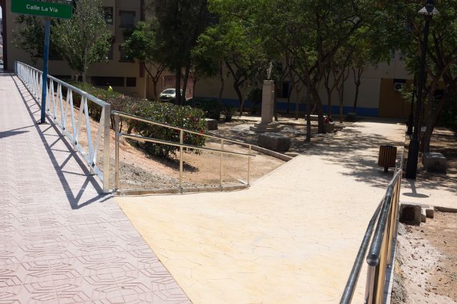 Otro de los puntos que ha cambiado de imagen ha sido el acceso peatonal al Jardín de la Paz situado en la Avenida de la Constitución de Mazarrón. Una valla salva el desnivel generado por el talud de tierra que separa la entrada al jardín por la calle La Vía, generando así mayor seguridad. También se ha creado una rampa para mejorar el acceso. El presupuesto de la obra ha sido de 6.655 euros.