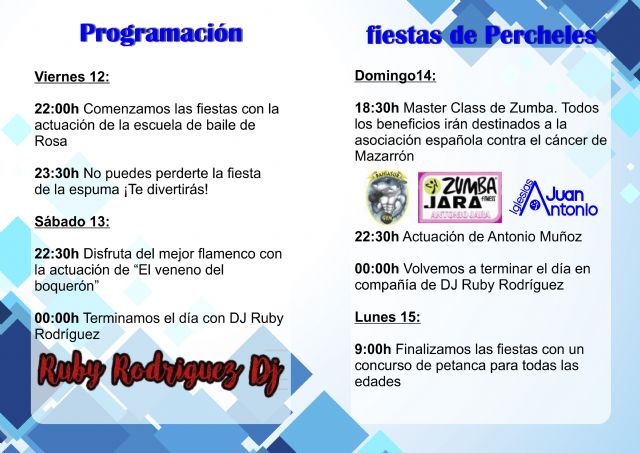 Percheles estará de fiestas durante el próximo fin de semana. Del 12 al 15 de agosto, la Comisión de Fiestas de Cañada de Gallego y el Ayuntamiento de Mazarrón invitan a disfrutar de un programa de actividades dirigido a todos los públicos y elaborado con la idea de ofrecer un ambiente divertido y familiar junto a una de las playas de mayor belleza del litoral mazarronero.
