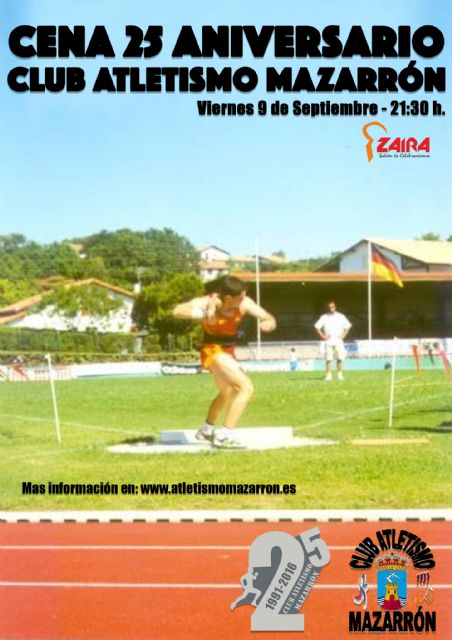 El Club Atletismo Mazarrón cumple, este miércoles 31 de agosto, 25 años desde su creación. Para celebrar este primer cuarto de siglo, la directiva ha organizado una cena aniversario prevista para el próximo viernes 9 de septiembre a las 21:30 horas en los salones de celebraciones "Zaira" de Bolnuevo.