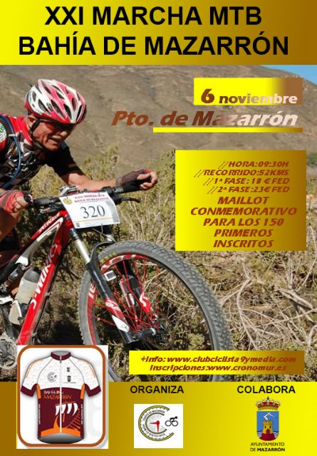 Alrededor de 300 participantes estarán presentes en la línea de salida de la XXI Marcha MTB Bahía de Mazarrón que organiza el "Club Ciclista 9 y Media" en colaboración con la Concejalía de Deportes del Ayuntamiento de Mazarrón. La marcha ha sido presentada este jueves por la alcaldesa de Mazarrón, Alicia Jiménez, y por el presidente del "Club Ciclista 9 y Media", José De la Cruz Sánchez.