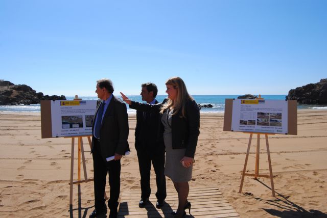 El delegado del Gobierno, Antonio Sánchez Solís, acompañado de la alcaldesa de Mazarrón, Alicia Jiménez, y el jefe de la Demarcación de Costas del Estado, Andrés Martínez, ha recorrido esta mañana algunas de las playas de la localidad en las que el Ministerio de Agricultura y Pesca, Alimentación y Medio Ambiente está ejecutando obras de emergencia para reparar los daños ocasionados por los temporales del pasado mes de diciembre.