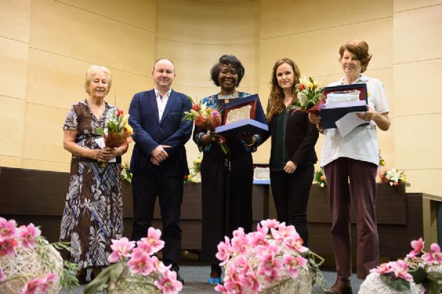 El Colectivo de Mujeres Extranjeras de las distintas asociaciones del municipio recibió este domingo el Premio Mujer Mazarronera 2017 en un acto celebrado en el Centro Cultural de Mazarrón. Este reconocimiento fue otorgado por la Asociación de Amas de Casa, Usuarios y Consumidores AlMazarrón, Cruz Roja, Asociación Musical Maestro Eugenio Calderón, la Asociación de Comerciantes de Mazarrón, la Asociación de Amas de Casa, Usuarios y Consumidores AlFaro de Puerto de Mazarrón, Cáritas Puerto y la Concejalía de Política Social. El premio reconoce la labor social y de ayuda a desfavorecidos que prestan estas mujeres en las diferentes asociaciones en las que colaboran.