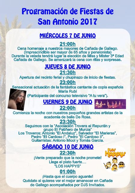 Los vecinos de Cañada de Gallego ya viven sus fiestas patronales en honor a San Antonio, a celebrar entre el 7 y el 13 de junio. La programación cuenta este año con dos actuaciones musicales destacadas: la de cantante mazarronero José María "El Luiso", tras su exitoso paso por el programa "La Voz" de Telecinco y la de "Los Happys", un grupo muy conocido en Mazarrón por su presencia en las dos ediciones de "La Isla Fun Fest". El Luiso actuará el domingo 11 de junio y "Los Happys" de Antonio Hidalgo lo harán un día antes, el sábado 10 de junio.