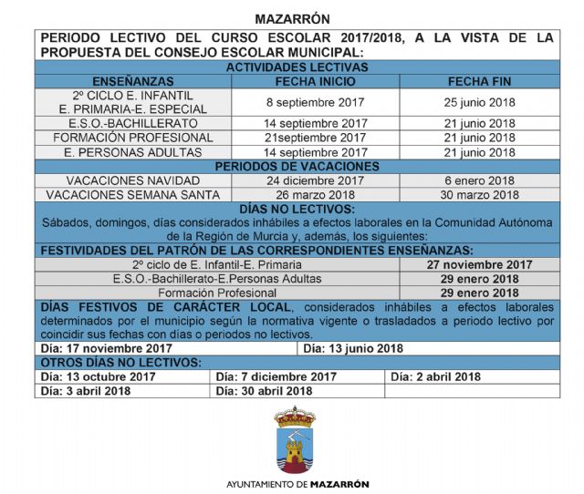 Asimismo, los días festivos de carácter local que afectan al calendario escolar serán el 17 de noviembre y el 13 de junio.