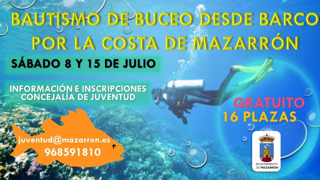 El Centro de Buceo Hispania y la Concejalía de Juventud oferta para el 8 y el 15 de julio dos nuevas sesiones de bautismo de buceo en el mar desde barco. La actividad es gratuita para jóvenes de Mazarrón de entre 14 y 35 años.