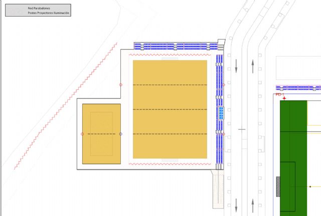 En los laterales N y E del campo de fútbol playa se contemplan 3 filas de graderío (para unas 350 personas) mediante placas prefabricadas de hormigón para albergar público de modo que se adaptan las rasantes de lo proyectado a lo existente minimizando los movimientos de tierra.