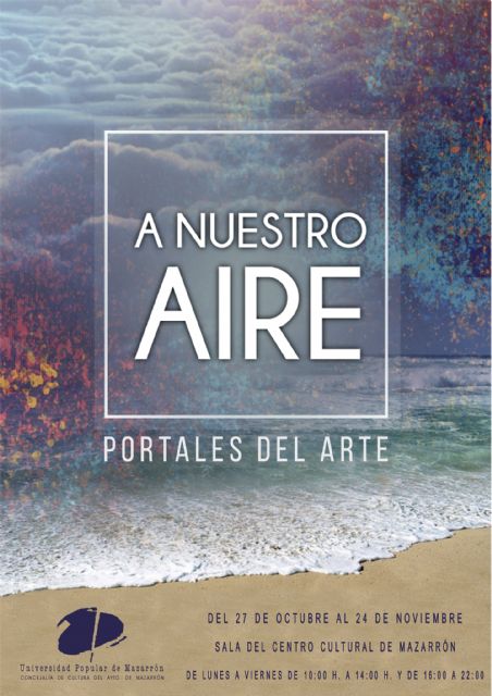 La Universidad Popular de Mazarrón y la Concejalía de Cultura del Ayuntamiento de Mazarrón presentan este viernes 27 de octubre la muestra colectiva "A nuestro aire" que da cabida al trabajo de 14 artistas: Salvador Caro, Santiago Cruz, Alba Dalmau, José Dalmau, Antonio Egea, Javier Egea, Lourdes Fernández, Ángela Fernández-Rufete, Encarna Fernández-Rufete, Adela García, Sol García, Charo Martínez, Lola Navarro y Beatriz Romera.