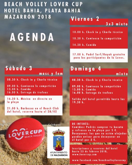 La playa de Bahía acogerá los días 2, 3 y 4 de marzo la Beach Volley Lover Cup. Se trata de la cuarta edición de una competición dirigida a distintos niveles en las categorías de 3x3, masculino y femenino y 2x2. El evento será amenizado con música en directo, actividades náuticas y barbacoas para los participantes.