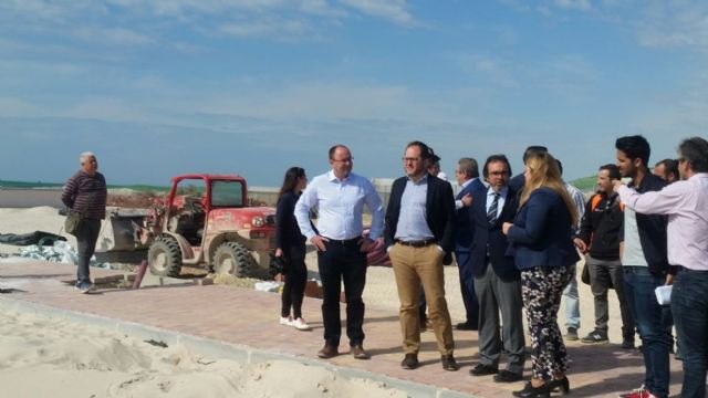 El consejero de Presidencia, Pedro Rivera, junto a la alcaldesa de Mazarrón, Alicia Jiménez, visitó hoy el complejo deportivo de la Media Legua, en la carretera entre la localidad y el Puerto, para conocer las obras que se desarrollan con cargo al Plan de Obras y Servicios 2017, por las que la Comunidad financia con 184.000 euros la construcción de sendos campos de vóley playa y fútbol playa.