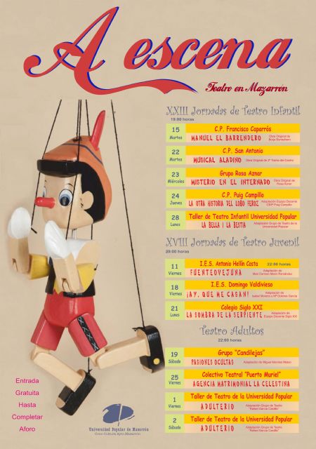 La Universidad Popular de Mazarrón, en colaboración con la Concejalía de Cultura del Ayuntamiento de Mazarrón, ha organizado un año más su programa de actividad teatral "A escena" que incluye trece funciones que se llevarán a cabo en la sala de la Avenida de la Constitución de Mazarrón. El programa supone la celebración de la XXIII Jornadas de Teatro Infantil, las XVIII Jornadas de Teatro Juvenil y una nueva edición de la sección de Teatro de Adultos.