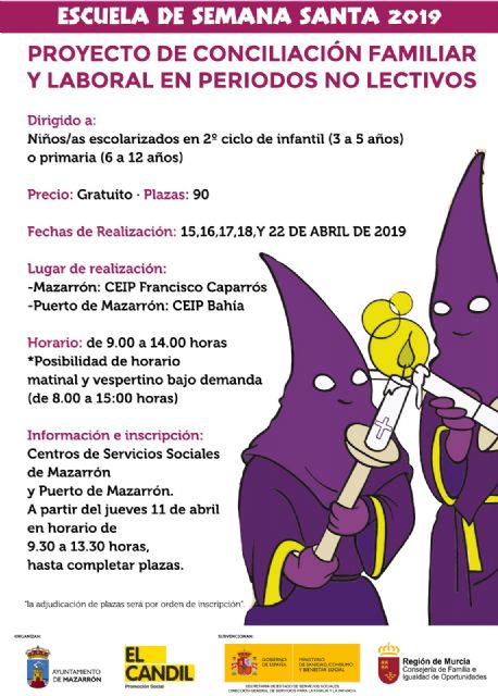 El Ayuntamiento de Mazarrón y el colectivo de promoción social 'El Candil' ofertan 90 plazas para la Escuela de Semana Santa que albergarán los CEIP Francisco Caparrós de Mazarrón y Bahía de Puerto de Mazarrón. La iniciativa se enmarca dentro del Proyecto de Conciliación Familiar y Laboral en Periodos No Lectivos. La inscripción es gratuita y está dirigida a niños escolarizados desde segundo ciclo de Infantil (3 a 5 años) y de Primaria (6 a 12 años).