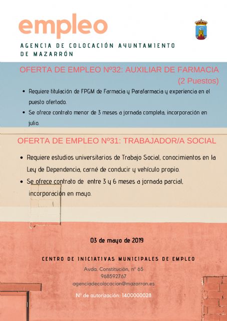 La Agencia de Empleo del Ayuntamiento de Mazarrón notifica la existencia de nuevas ofertas de empleo para cubrir 2 puestos de auxiliar de farmacia y 1 puesto de trabajador social.