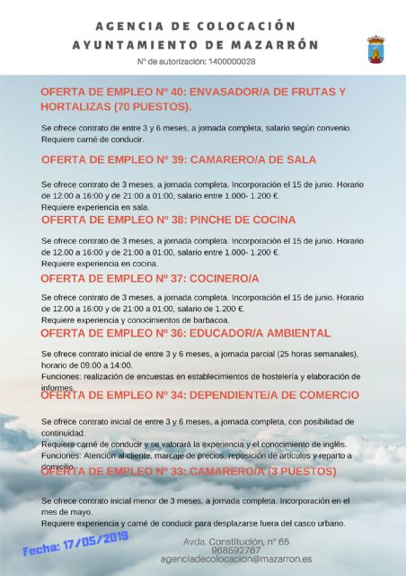 La Agencia de Empleo del Ayuntamiento de Mazarrón notifica la existencia de nuevas ofertas de empleo para cubrir 70 puestos de envasador/a de frutas y hortalizas, 3 puestos de camareros, 1 puesto de camarero de sala, 1 puesto de pinche de cocina, 1 puesto de cocinero, 1 educador ambiental y 1 puesto de dependiente de comercio.