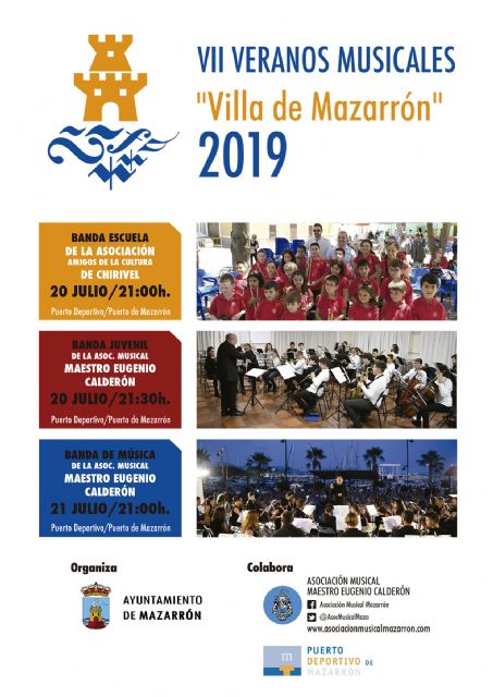 Este año los ‘VII Veranos Musicales “Villa de Mazarrón” 2019’ y constarán de dos conciertos a las nueve de la noche. El primero de ellos tendrá lugar el sábado 20 de Julio con la actuación de la banda-escuela de la Asociación ‘Amigos de la Cultura’ de Chirivel y la banda juvenil de la Asociación Musical ‘Maestro Eugenio Calderón’ de Mazarrón. El segundo de ellos será al día siguiente, 21 de julio, con la banda de música anfitriona, la Asociación Musical ‘Maestro Eugenio Calderón’.