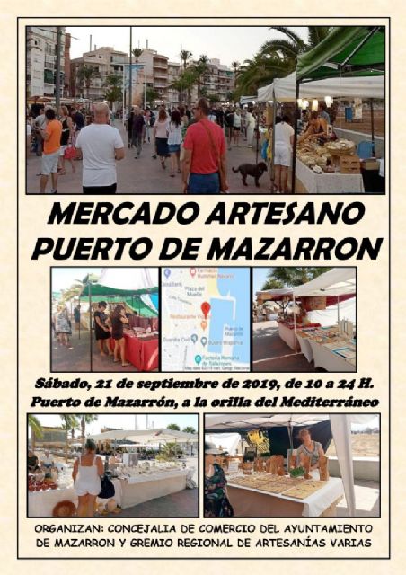 24 puestos de artesanía se darán cita en el Mercado Artesano de Puerto de Mazarrón que se celebra este sábado 21 de septiembre en el paseo marítimo de la localidad costera. El mercado, organizado por la concejalía de Comercio y el Gremio Regional de Artesanías Varias, estará instalado desde las 10 de la mañana y hasta la medianoche.