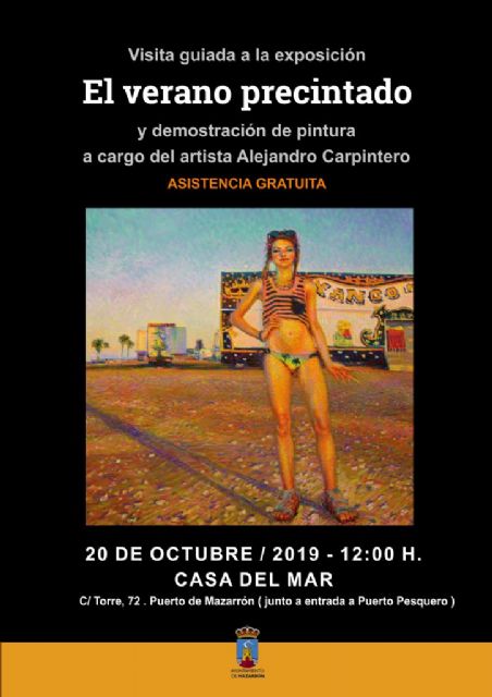 El artista madrileño Alejandro Carpintero, que el pasado 14 de septiembre acudía a Puerto de Mazarrón para inaugurar su muestra pictórica 'El Verano Precintado', regresa al municipio este domingo 20 de septiembre para realizar una visita guiada gratuita a su exposición, la cual se encuentra abierta al público en el edificio de 'La Casa del Mar' de la localidad Costera.