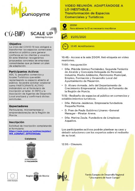 Este viernes 15 de mayo, se va a realizar una vídeo-reunión dirigida a empresas y pymes de toda la Región titulada 'Adaptación de los espacios públicos en comercios y empresas turísticas' organizada por el Agencia de Desarrollo Local del Ayuntamiento de Mazarrón y el Instituto de Fomento de la Región de Murcia (INFO) dentro de las iniciativas que se llevan a cabo en la Red Punto Pyme.