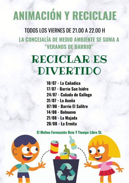 La Concejalía de Medio Ambiente del Ayuntamiento de Mazarrón ha programado una serie de talleres de animación y reciclaje que se realizarán en diversos barrios y pedanías del municipio, sumándose a los 'Veranos de Barrio' organizados por Festejos.