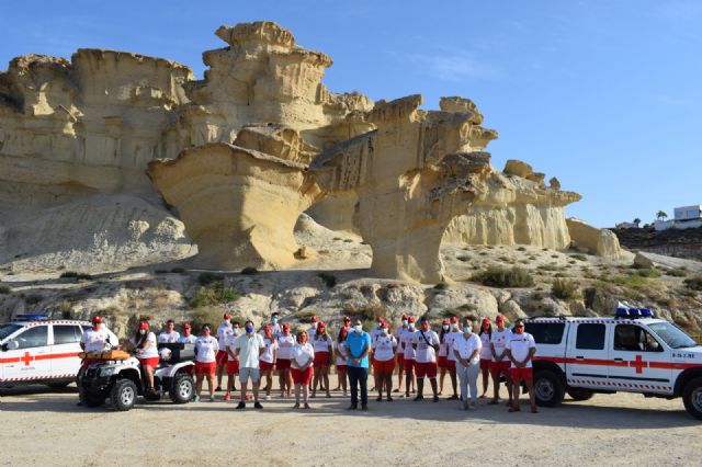 El alcalde de Mazarrón, Gaspar Miras; acompañado de los concejales de Protección Civil y SEM, Francisco José García, y Turismo y Servicios del Litoral, Raquel Raja, acudieron al entorno de las Erosiones de Bolnuevo donde mantuvieron un encuentro con los informadores de playas de Cruz Roja quienes iban encabezados por su presidenta, Carmen Navarro.