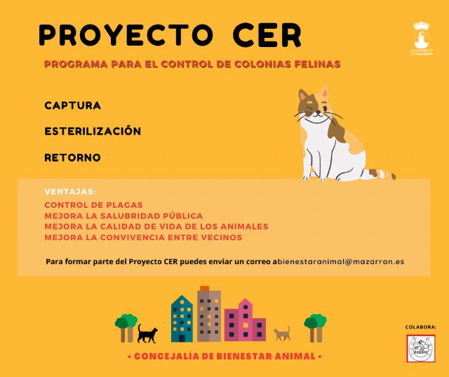 La edil ha añadido que "en Mazarrón se ha generado un descontrol y desconocimientos sobre el cuidado de las colonias, que provoca conflictos vecinas y problemas de salubridad" por lo que "se habilitará en las proximidades del cementerio una zona para la recuperación y reubicación de algunas colonias, creando zonas seguras para los animales y salubres para el municipio. Además, en las zonas más problemáticas, también se habilitarán zonas para el control de las colonias". García ha puntualizado que "este método en ningún caso será para atender a gatos de particulares" y ha invitado a aquellos que "quiera participar en el proyecto, pedir más información o tenga alguna colonia felina pueden ponerse en contacto a través de bienestaranimal@mazarron.es".