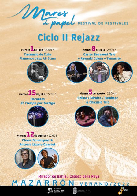 La Concejalía de Cultura del Ayuntamiento de Mazarrón, que encabeza el edil Ginés Campillo, y el Club Jazzazza de Algezares (Murcia), de José Joaquín Baeza, vuelven a unirse para darle al festival ‘Mares de Papel’ su segunda edición de ‘Rejazz’, el ciclo musical que, ya en 2021, trajo el mejor jazz a las noches del Mirador de Bahía. Aún se recuerda el éxito en la afluencia de público, así como la calidad artística, en las actuaciones de Cotijazz Big Band, Hetty Kate Quintet, Dómisol Sisters, Dan Barrett & Enric Peidro Quintet, Swing Machine Orchestra y Andrés Santos Station Band.
