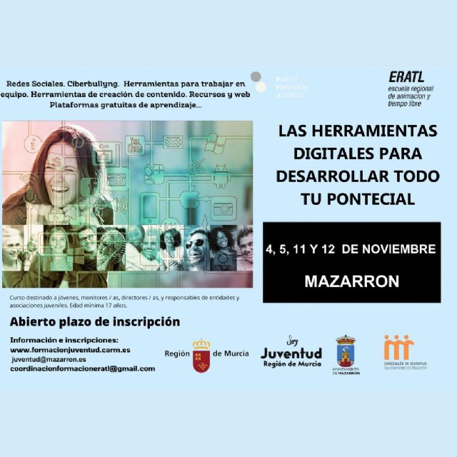 Continúa el Plan de Formación de Juventud, incluyendo nuevas propuestas formativas. Estas acciones de formación no formal, se realizan desde la Dirección General de Juventud en conjunto con la escuela regional de animación y tiempo libre y las Concejalías de Juventud de la Región de Murcia. Desde la Concejalía de juventud del Ayuntamiento de Mazarrón y sus redes sociales, se realizó una encuesta para conocer las demandas e intereses de los jóvenes, siendo la propuesta más votada la realización del curso: HERRAMIENTAS DIGITALES PARA DESARROLLAR TODO TU POTENCIAL.