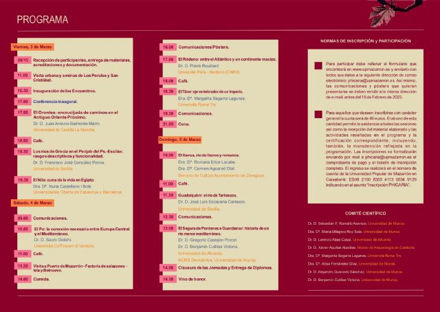 Las jornadas contarán con 9 conferencias y 3 comunicaciones con una extensa temática. La conferencia inaugural correrá a cargo de Juan Antonio Belmonte Marín – El orontes: encrucijada de caminos en el Antiguo Oriente Próximo. Tras él será el turno de Francisco José González Ponce con su conferencia – Los ríos de Grecia en el Periplo del Ps.- Escilax: rasgos descriptivos y funcionalidad. La tercera conferenciante será Nuria Castellano i Solé con El Nilo: cuna de la vida en Egipto. El sábado se dará comienzo con la ponencia de Sauro Gelichi – El Po: la conexión necesaria entre Europa Central y el Mediterráneo, ya por la tarde será el turno de Pierre Rouillard y su conferencia: El Ródano: entre el Mediterráneo y un continente macizo, para continuar con María Margarita Segarra Lagunes y su conferencia – El Tiber: eje vertebrador de un imperio. Por último, el domingo se comenzará con la conferencia de Romana Erice Lacabe Y Carmen Aguarod Otal – El Iberus, río de iberos y romanos, continuará la jornada la conferencia de José Luis Escacena Carrasco – Guadalquivir: el río de Tartessos, para terminar con la Conferencia de Clausura a cargo de Gregorio Castejón Porcel y Benjamín Cutillas Victoria – El Segura de Pontones a Guardamar: historia de un río menor mediterráneo.