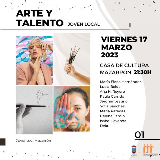 Tras un periodo de recepción de propuestas, el proyecto ‘Arte y Talento Joven Local’ de la Concejalía de Juventud del Ayuntamiento de Mazarrón contará con la participación de diez jóvenes artistas mazarroneros: María Elena Hernández, Lucía Belda, Ana H. Reyero, Paula Garrido, Jeronimosaurio, Sofía Sánchez, María Paredes, Helena Lardín, Isabel Lavanda y Deku. Las obras de todos ellos conforman la exposición colectiva que se inaugurará el próximo viernes, 17 de marzo, a las 21:30 horas en la Casa de Cultura de Mazarrón.