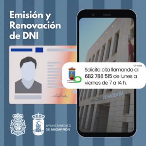 Ya se puede solicitar cita telefónica para la emisión y renovación del Documento Nacional de Identidad (DNI) en el municipio de Mazarrón. Para ello, se deberá obtener por vía telefónica en el número 682 788 515 de lunes a viernes en horario de 7:00 a 14:00 horas. Dos veces al mes, los efectivos de la Policía Nacional se desplazarán al edificio de la Concejalía de Hacienda (Calle General Gómez Jordana, 6, 30870 Mazarrón) para emitir y renovar el DNI.
