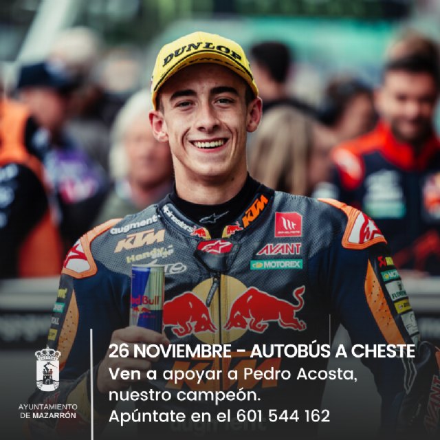 El Ayuntamiento de Mazarrón te lleva a Cheste (Valencia) para apoyar a nuestro campeón Pedro Acosta en su última carrera de la temporada.