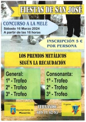 - Torneo de Petanca Fiestas San José que se va a celebrar el próximo sábado 16 de marzo en la sede de Puerto de Mazarrón. Concurso a la Melé donde podrán participar todos los deportistas locales y regionales que nos visitarán a partir de las 16:00 h. en las instalaciones del Rihuete.