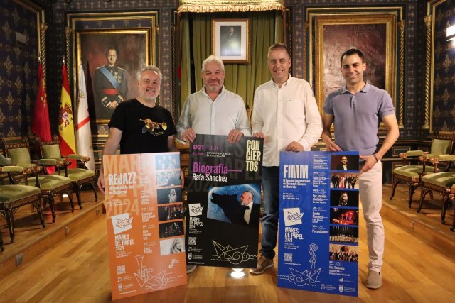 El alcalde Ginés Campillo y el concejal de Cultura Jorge Durán, junto a los organizadores de los cliclos de ReJazz y FIMM, Jota Lacarcel y Antonio García, respectivamente. Han anunciado más detalles de las próximas jornadas del festival ‘Mares de Papel’. El festival que destaca entre otras cosas por los reconocidos ciclos que han ganado prestigio por su calidad y diversidad de oferta cultural.