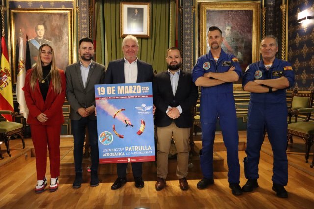 Esta mañana, el alcalde de Mazarrón, Ginés Campillo, junto a los concejales de Festejos y Puerto, Miguel Ángel Peña y Ana Ruiz, han anunciado oficialmente la celebración de la esperada exhibición acrobática de la Patrulla Acrobática de Paracaidismo del Ejército del Aire y del Espacio (PAPEA). El acto ha contado con la presencia del Capitán José Luis Lomas Albadelejo, jefe de la PAPEA, y del Subteniente Alberto Vidal Moreira, jefe de Instrucción y Adiestramiento de la unidad.