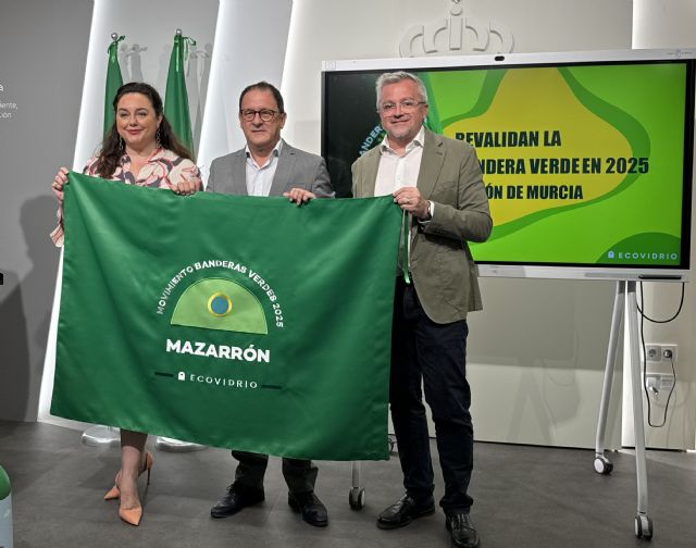 La entrega de la Banderas Verdes ha tenido lugar hoy en la Consejería de Medio Ambiente, Universidades, Investigación y Mar Menor, donde María Cruz Ferreira, secretaria autonómica de Energía, Sostenibilidad y Acción Climática de la Región de Murcia y Roberto Fuentes, subdirector de Gerencias Zona Este de Ecovidrio, han hecho entrega la Bandera Verde a Gaspar Miras, concejal de Medio Ambiente del Ayuntamiento de Mazarrón.